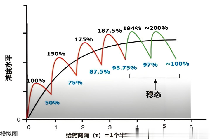 这是因为药物要在身体里发挥稳定的作用,需要慢慢在身体里“积攒”到一定的量,医学上说是“蓄积”。因为吃进来的药物是要代谢和排泄的,所以要到每天吃进来补充的药和代谢、排泄出去的药量差不多的时候,身体里的药量才算攒足,作用也达到稳定了。到了那时,按医学上说,就是达到了稳态血药浓度。这个过程需要多长时间呢?需要经过药物的5~7个半衰期。药物的半衰期就是药物血药浓度下降到一半的时间。不同的药物半衰期不一样。所以半衰期短的药起效就快,半衰期长的药物呢,起效就慢。
